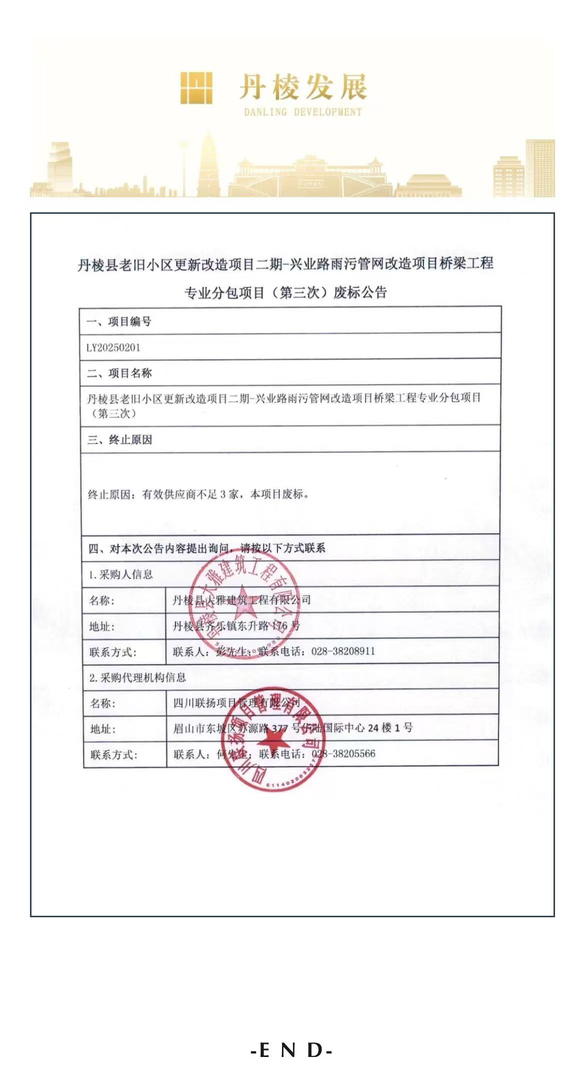 丹棱縣老舊小區(qū)更新改造項(xiàng)目二期-興業(yè)路雨污管網(wǎng)改造項(xiàng)目橋梁工程專業(yè)分包項(xiàng)目(第三次)廢標(biāo)公告